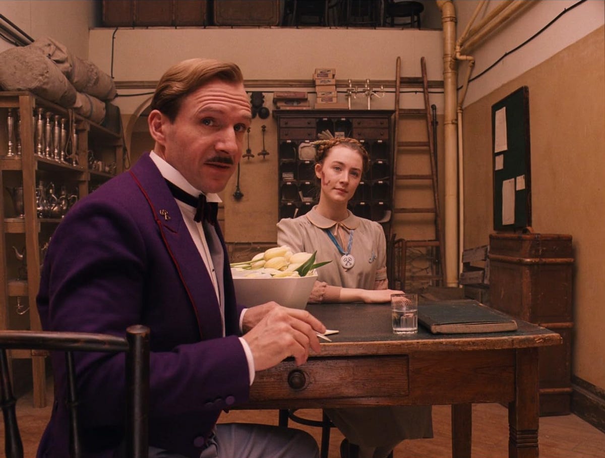 Eredetileg Saoirse Ronan miatt került nálam terítékre ez az általam korábban méltatlanul hanyagolt film. Noha az ír színésznőnek itt csak egy kisebb mellékszerep jutott, Wes Anderson munkáiban ez kifejezetten megtisztelőnek számít, hiszen az egyedi képi világáról könnyen felismerhető rendező előszeretettel választ a legkisebb epizódszerepekre is igazi sztárszínészeket. Andersont valószínűleg nem kell bemutatni senkinek – aki egyetlen filmjét is látta már, az felismeri a zseniális alkotó művészi stílusjegyeit. Tökéletesen és mániákusan szimmetrikus képek, gondosan válogatott és tudatosan alkalmazott pasztellszínek, színházi kliséket idézően leegyszerűsített, mégis gazdagon berendezett díszletvilág, extravagáns, képregénybe illő karakterek, és egy olyan univerzum, ami a valósággal párhuzamosan, de mégis teljesen külön szabályok szerint működik. A Grand Budapest Hotel ennek a stílusvilágnak talán az egyik legérettebb, legösszetettebb és legszórakoztatóbb példája.
